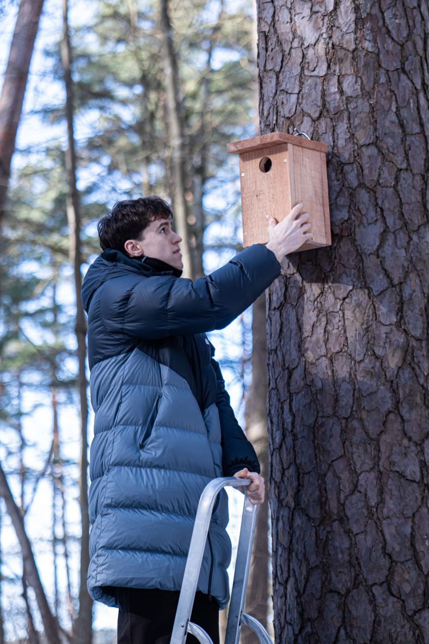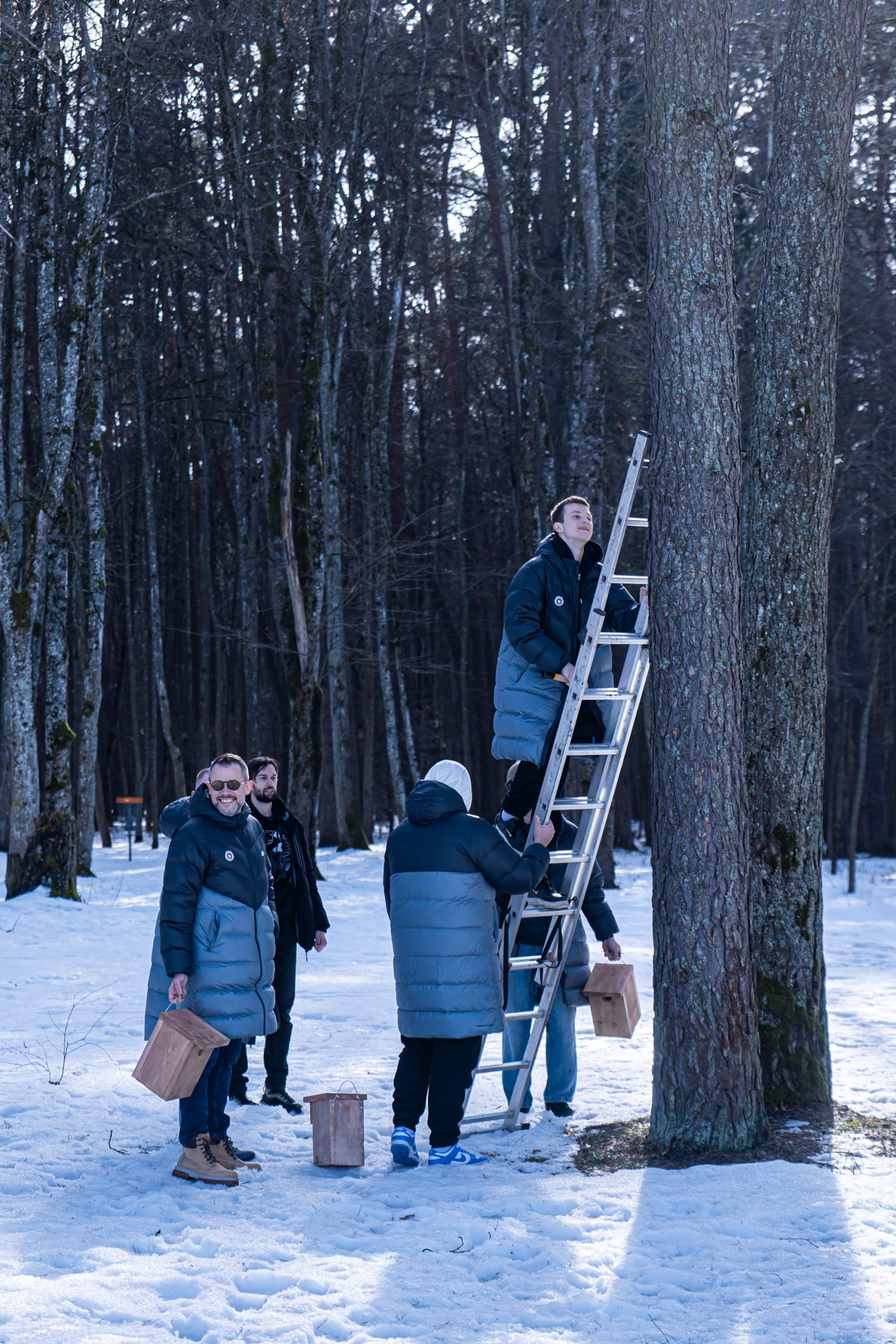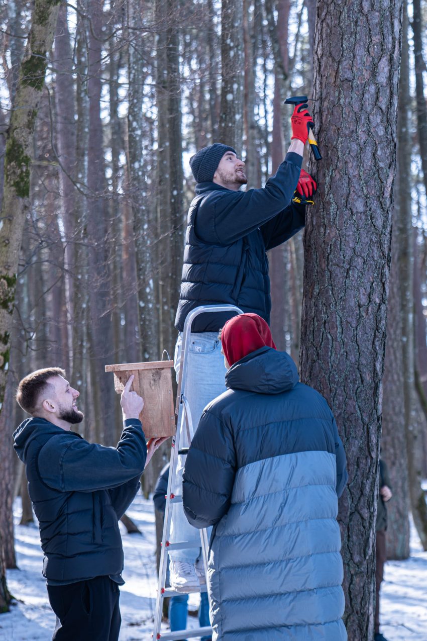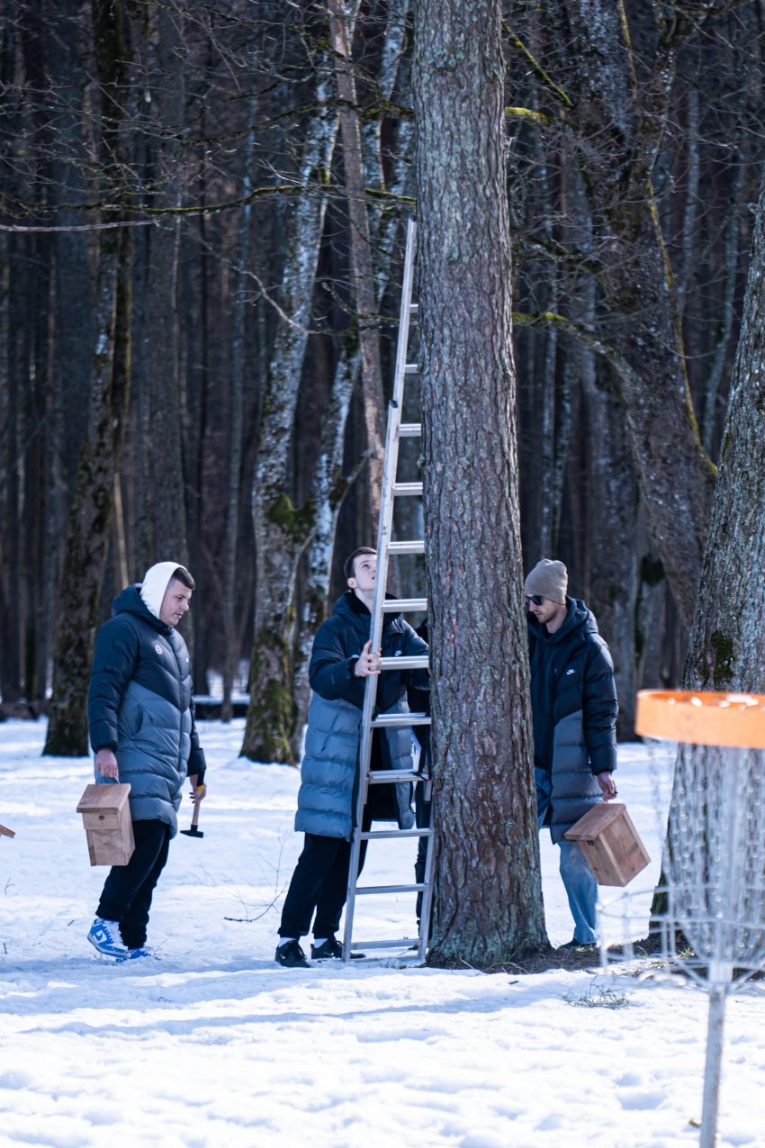 Satchel, BC Rytas, and Mes Darom teams hang bird feeders in Vingis Park