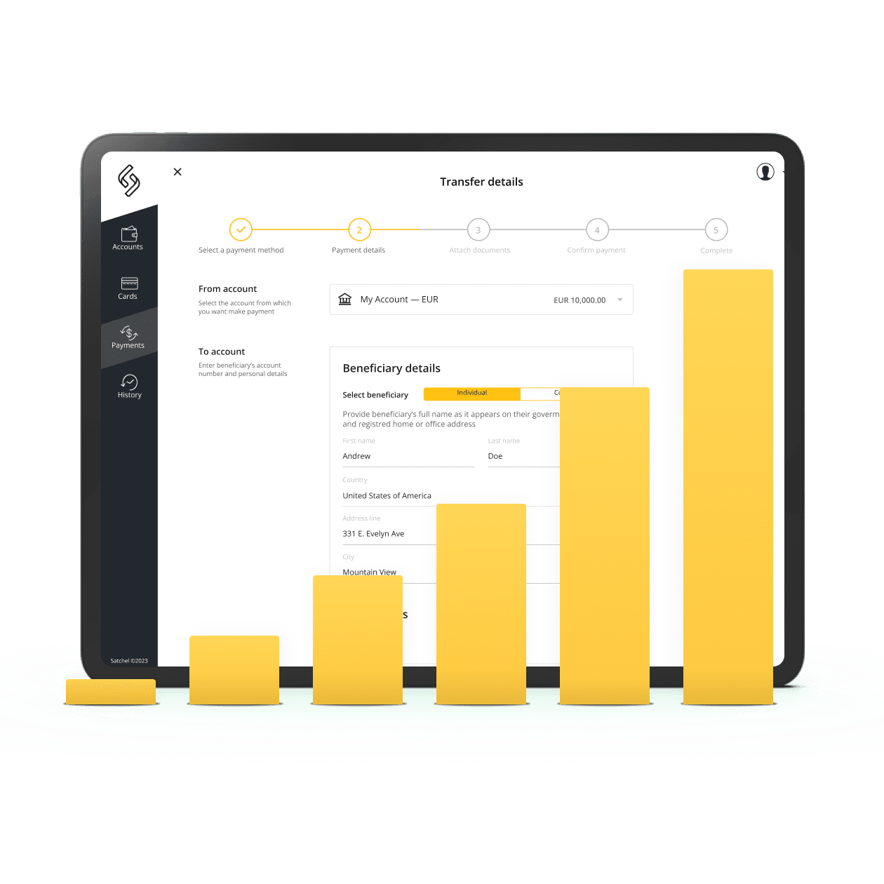 Get a unique European IBAN online and cover all business needs with Satchel payment cards.