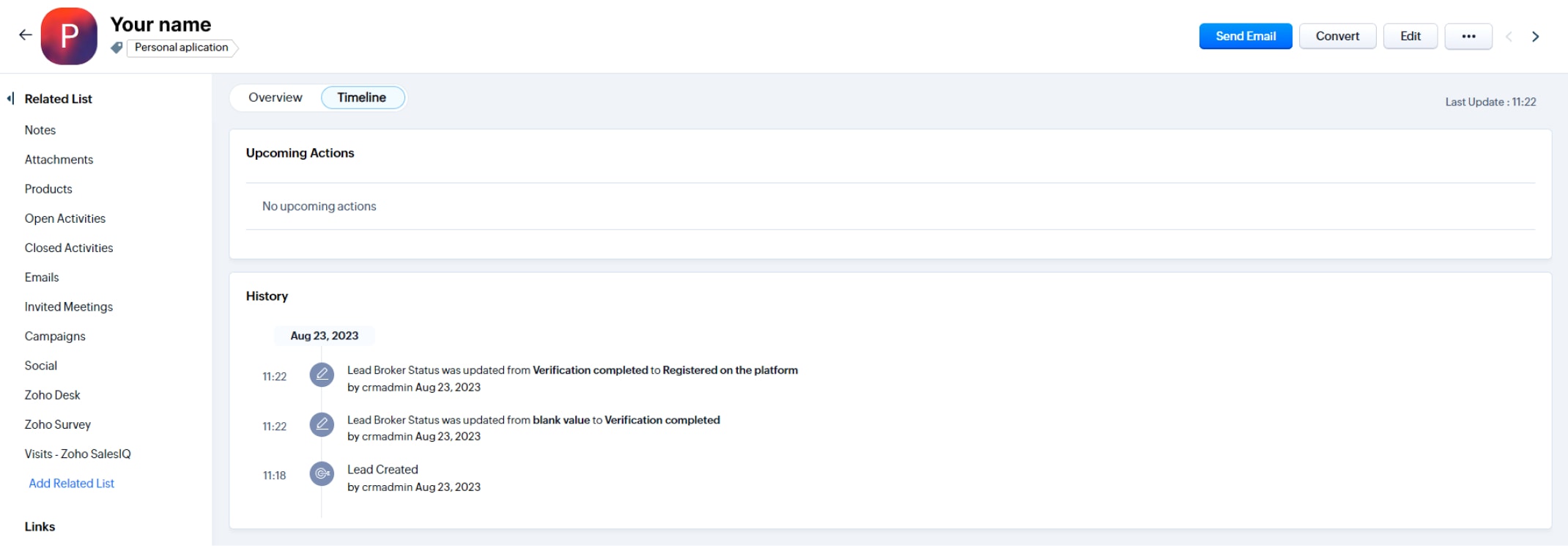 After the successful registration on the platform, the corresponding record in Satchel CRM is updated and changes “Lead broker status” field to “Registered on the platform” that comes simultaneously with “Verification completed” field update.