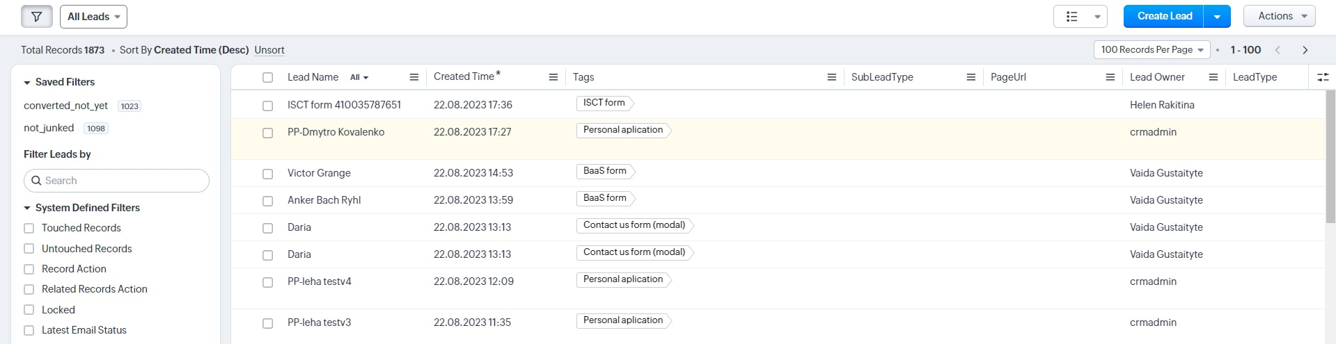 Record in ZOHO CRM is created